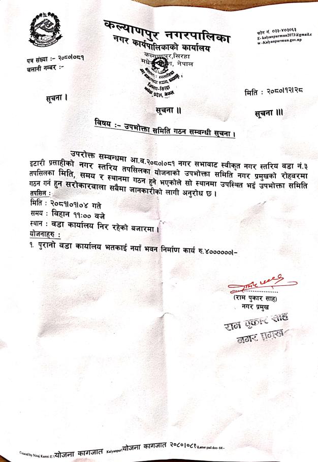 श्री योजना तथा अनुगमन शाखा, कल्याणपुर न.पा. सिरहा श्री प्राविधिक शाखा, कल्याणपुर न.पा.सिरहा