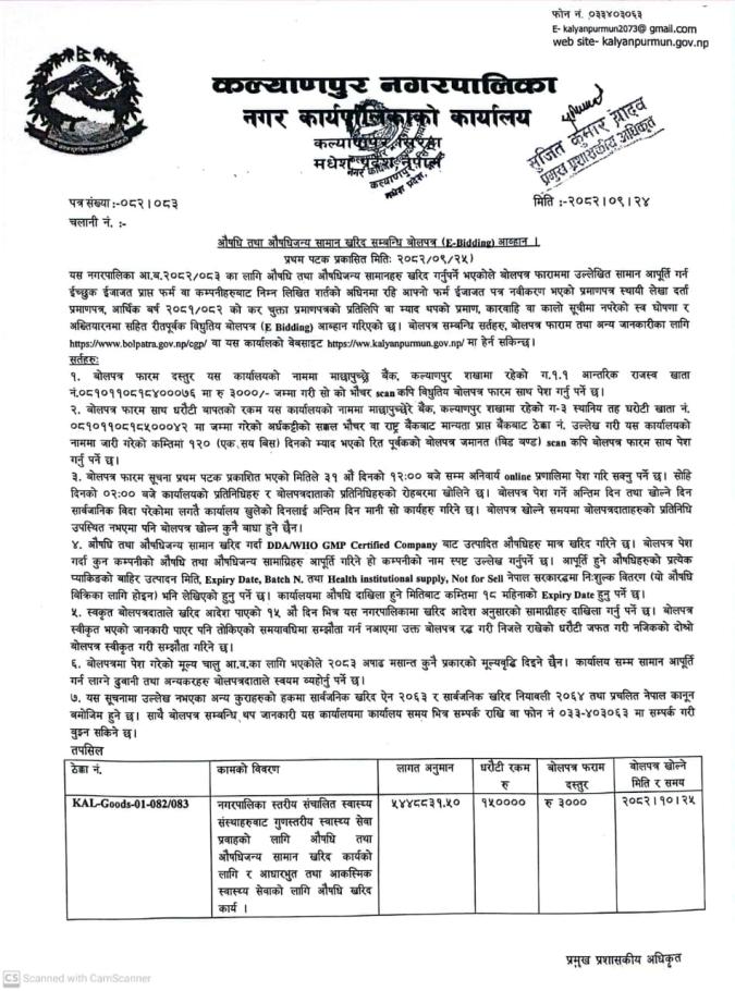 औषधि तथा औषधिजन्य सामान खरिद सम्बन्धि बोलपत्र (E-Bidding) आव्हान ।