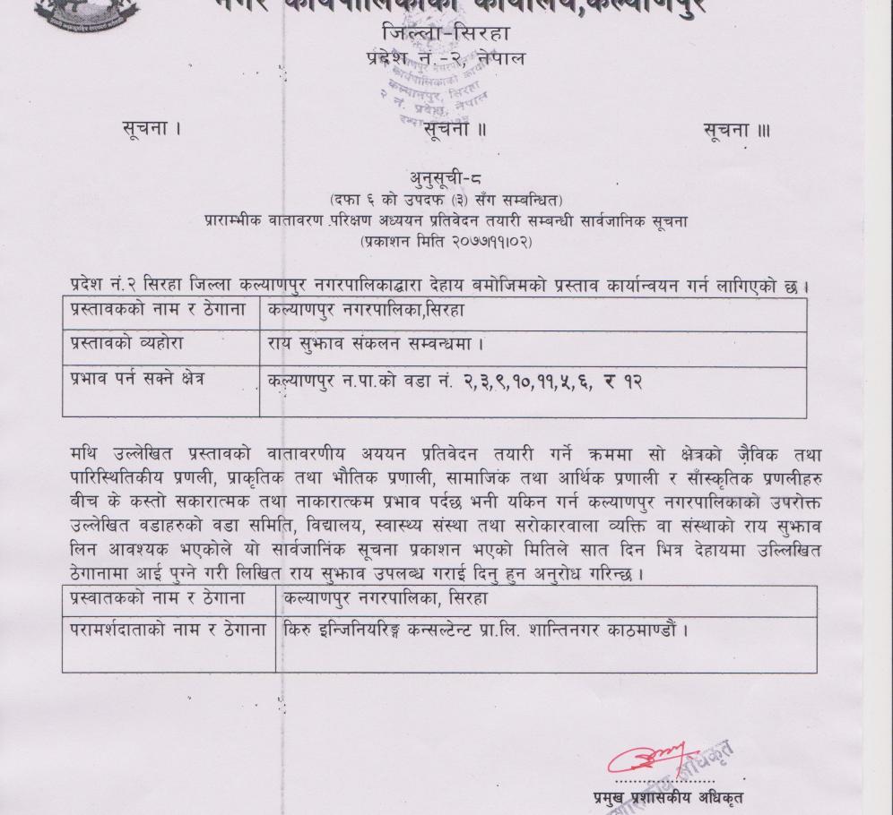 » प्राराम्भीक वातावरण परिक्षण अध्ययन प्रतिवेदन तयारी सम्बन्धी सार्वजानिक सूचना ।