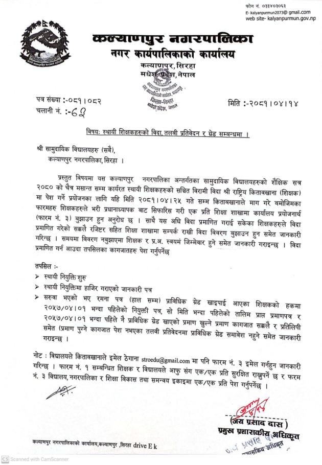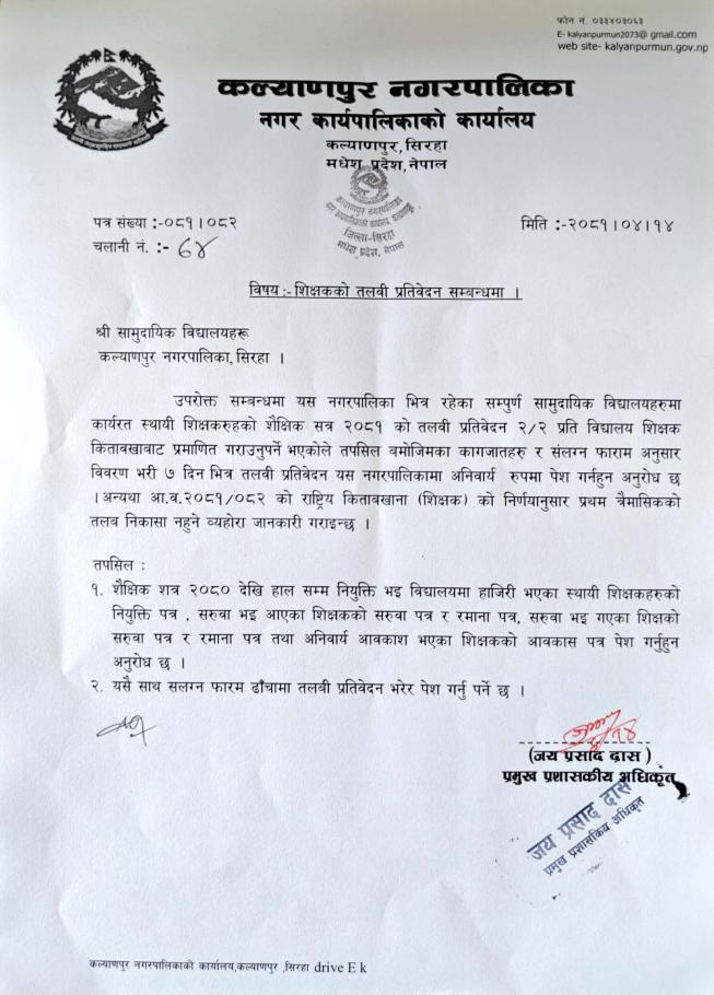 कल्याणपुर नगरपालिका,सिरहाको प्राविधिक सहायक करारमा पदपुर्ति सम्बन्धी सूचना
